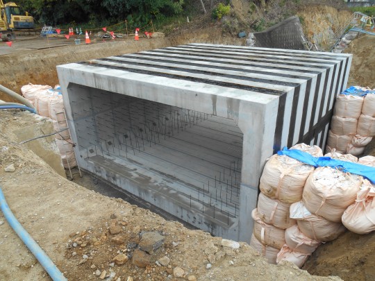 | 工事概要 | 現場打ちで計画していたボックスカルバートが、工期短縮と二次災害縮減のメリットからプレキャスト二次製品を採用していただきました。 お客様が低炭素型コンクリート製品に関心を持たれており、弊社のTEITANconを提案させていただきました。 弊社の低炭素型コンクリート「TEITANcon」は、コンクリートの原材料であるポルトラントセメントを55%以上高炉スラグ微粉末に置き換えた脱炭素化の環境配慮型コンクリートです。 令和7年度から国土交通省から発注される全ての工事が試行工事の対象となっており、今後は様々な機関からの需要が見込まれます。 今回の施工を通じて環境に配慮した脱炭素社会への取り組みにも貢献できました。 |